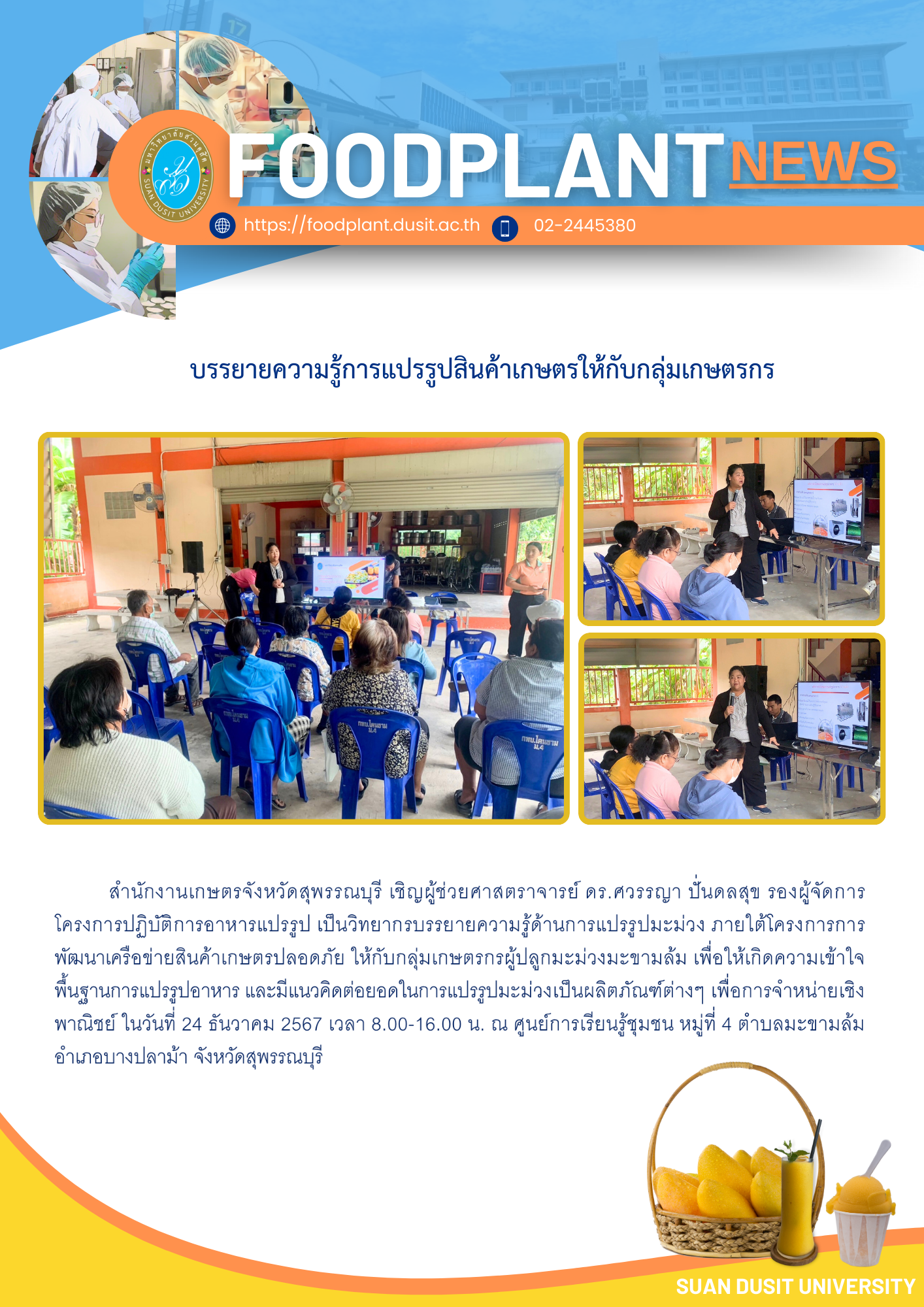 บรรยายความรู้การแปรรูปสินค้าเกษตรกลุ่มเกษตรกรผู้ปลูกมะม่วงมะขามล้ม จ.สุพรรณบุรี