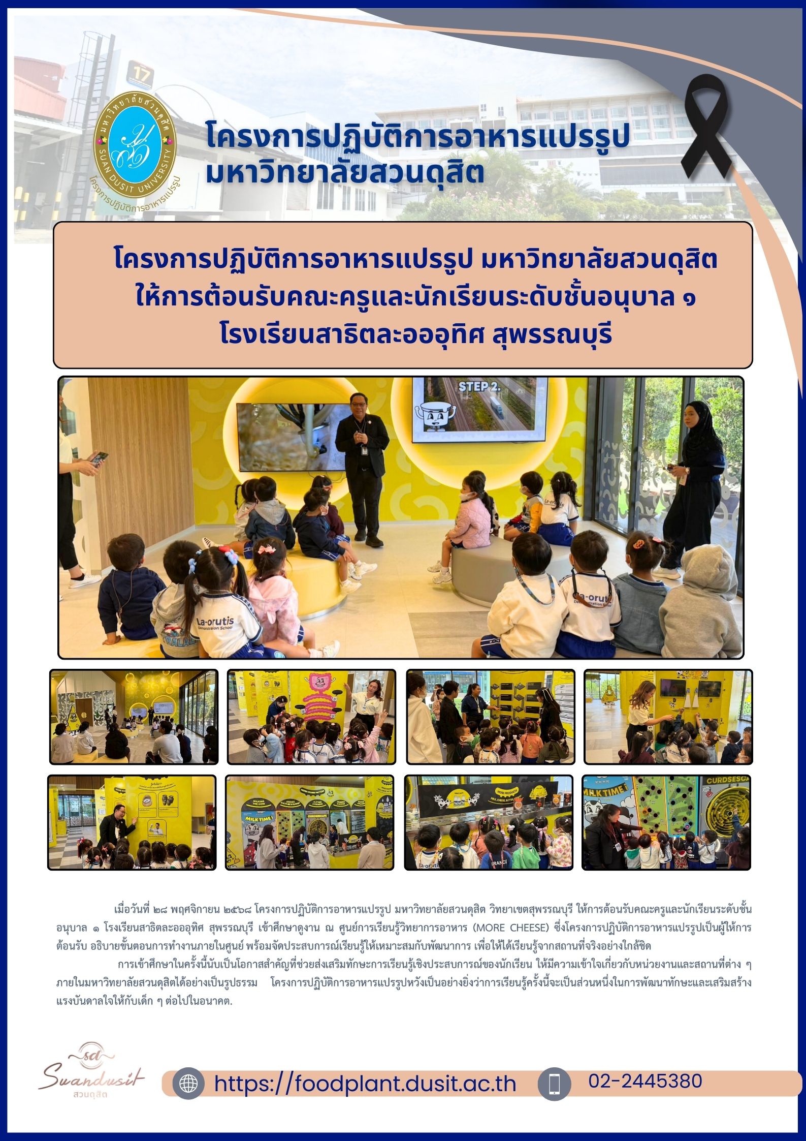 โครงการปฏิบัติการอาหารแปรรูป มหาวิทยาลัยสวนดุสิต ให้การต้อนรับคณะครูและนักเรียนระดับชั้นอนุบาล ๑ โรงเรียนสาธิตละอออุทิศ สุพรรณบุรี