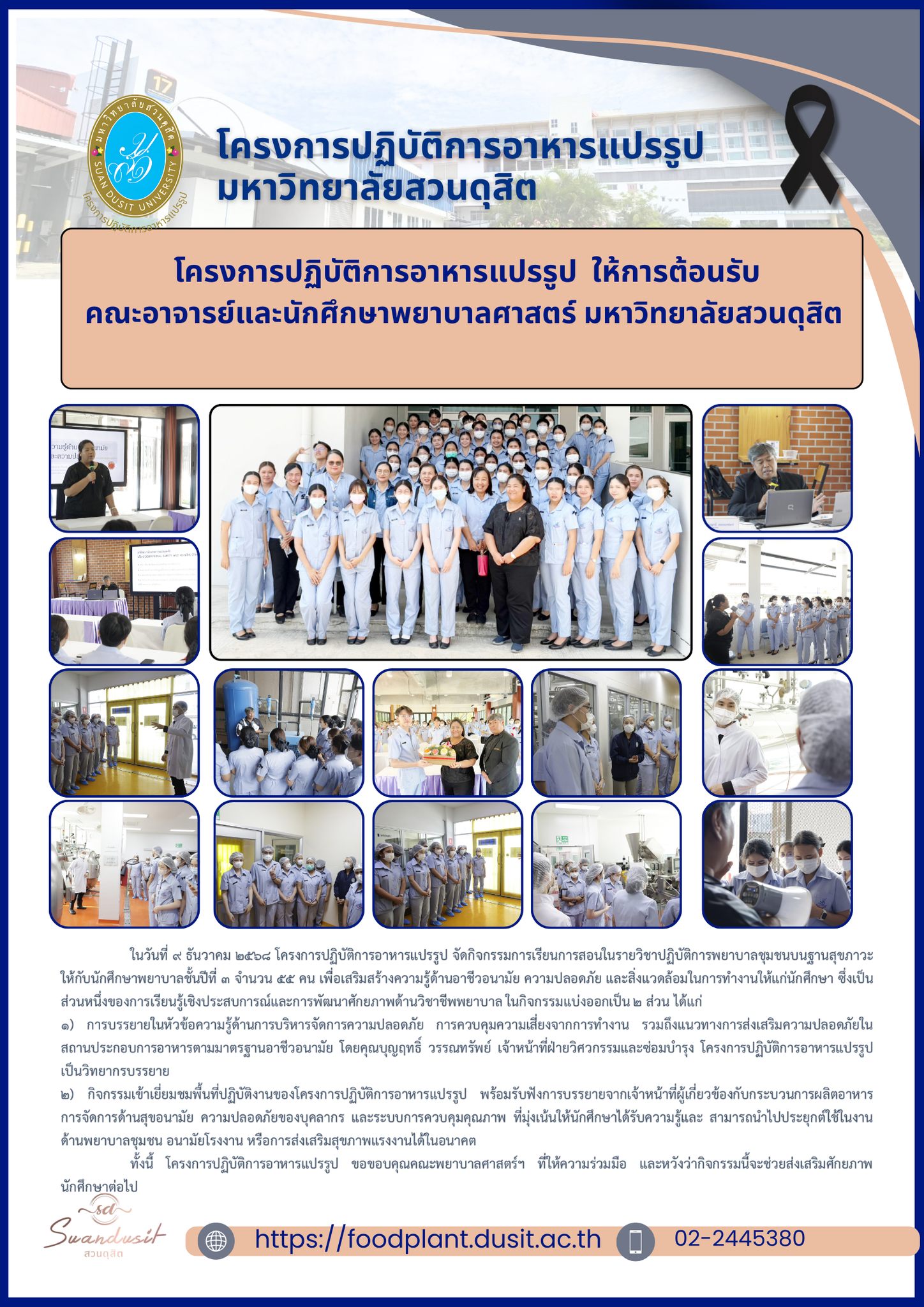 คณะพยาบาลศาสตร์ มหาวิทยาลัยสวนดุสิต เข้าศึกษาดูงานด้านงานอาชีวอนามัยความปลอดภัยและสิ่งแวดล้อม ณ โครงการปฏิบัติการอาหารแปรรูป มหาวิทยาลัยสวนดุสิต