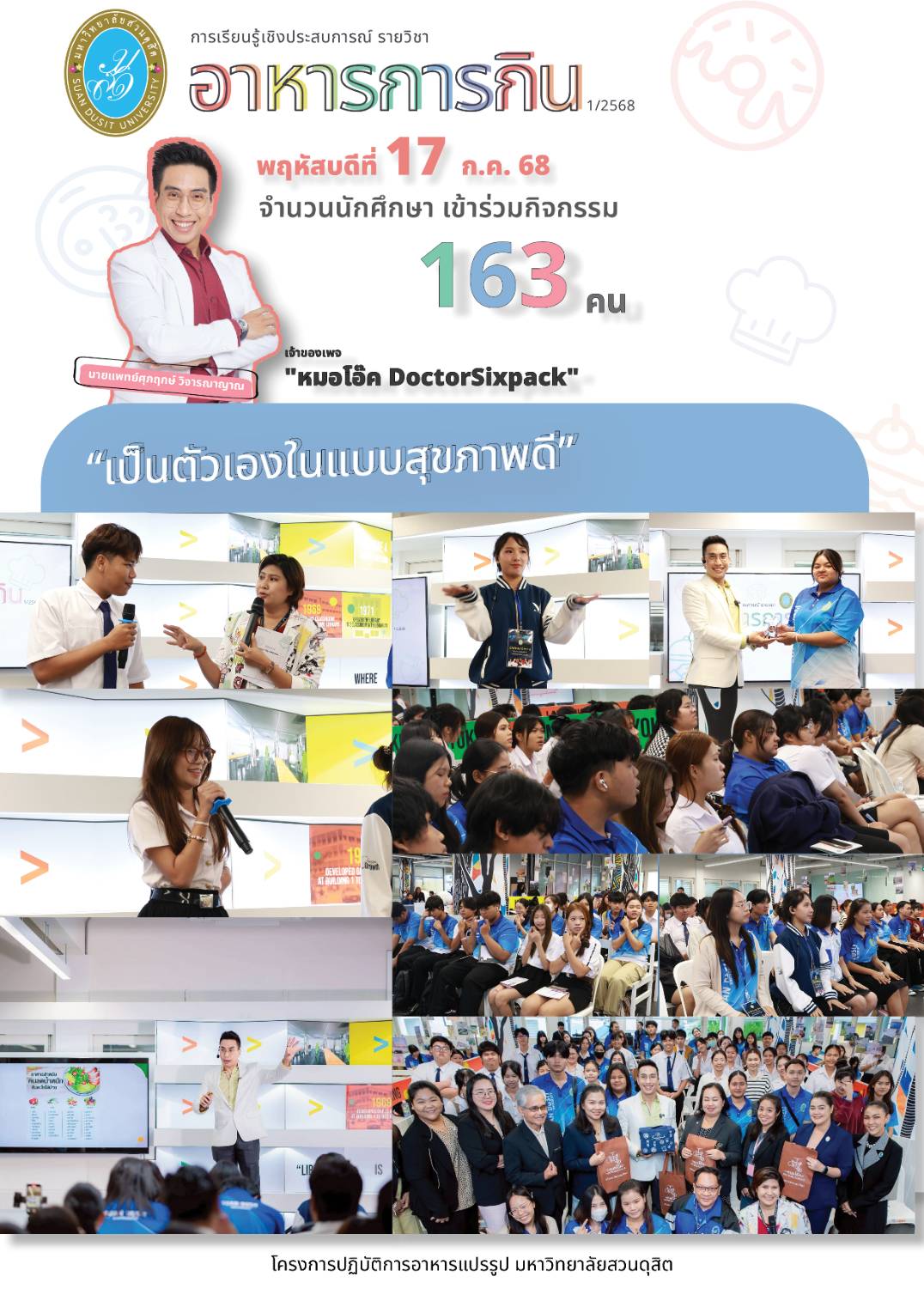 การเรียนรู้เชิงประสบการณ์รายวิชา “อาหารการกิน” บรรยายหัวข้อ “เป็นตัวเองในแบบสุขภาพดี” โดยได้รับเกียรติจาก โดย นายแพทย์ศุภกฤษ์ วิจารณญาณเจ้าของเพจ “หมอโอ๊ค DoctorSixpack”