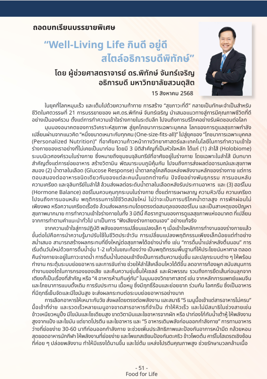 การเรียนรู้เชิงประสบการณ์รายวิชา “อาหารการกิน”บรรยายพิเศษ Well-living Life “Kin Dee You Dee”โดย ผศ.ดร.พิทักษ์ จันทร์เจริญ อธิการบดีมหาวิทยาลัยสวนดุสิต